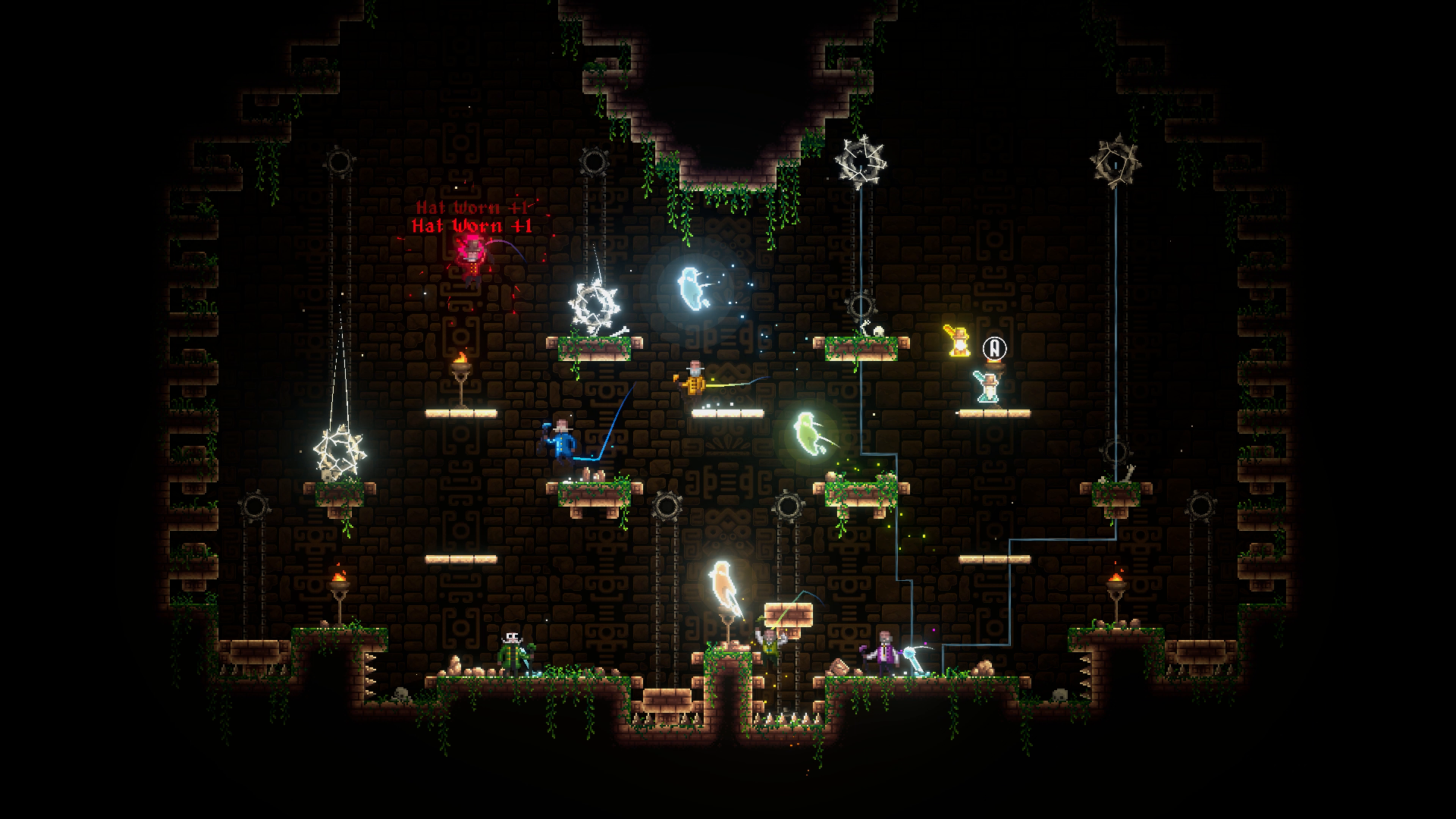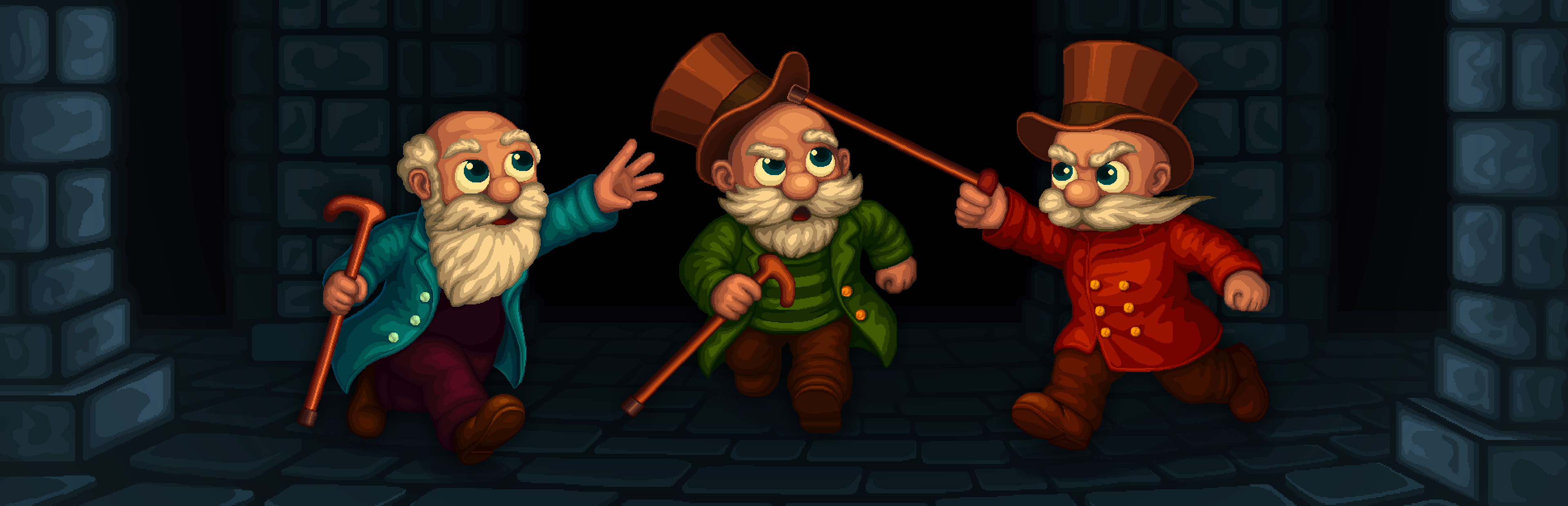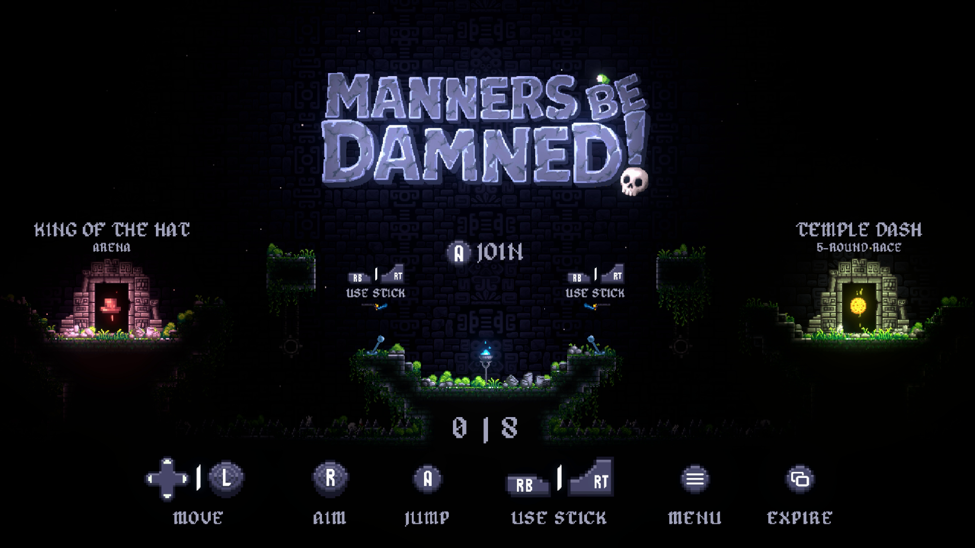 "Manners Be Damned!" is a couch co-op party platformer in which you and up to 8 of your friends will put your skills (and your friendships) to the test! Race through a trap-laden dungeon in a Temple Dash, or fight to the bitter end to keep control of what's most precious in a King of the Hat arena. The only tools you’ll have are your fancy canes - use them wisely - push each other into trouble, activate hidden mechanisms, send pesky projectiles towards your fellow competitors, or unceremoniously de-hat them for extra flare!